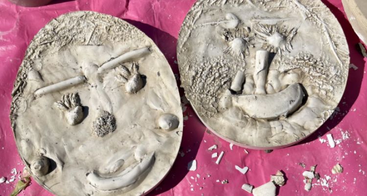 Imprinted Clay & Plaster Face Sculptures - This activity, focused on texture, form and surface, led by artist Dorcas Casey, gave children the opportunity to explore mark-making in clay, pressing in vegetables and plants to create expressive, tactile faces. They experimented with composition, facial features and imprint techniques, resulting in a diverse range of thoughtful and characterful sculptures.