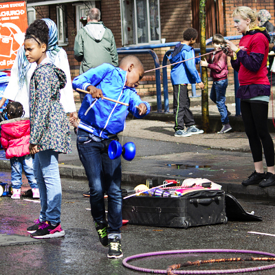 In particular, children enjoyed taking part in circus activities including stilt-walking and tight-rope walking, provided by the Invisible Youth! It was great for children to have the chance to skip and play freely in the middle of the street, facilitated by Playing Out, who got everyone involved in chalking on the pavement. Literati and Mufti provided indoor activities in the Trinity Centre and Stapelton Road Chapel and all had strong engagement from the community in their offer.